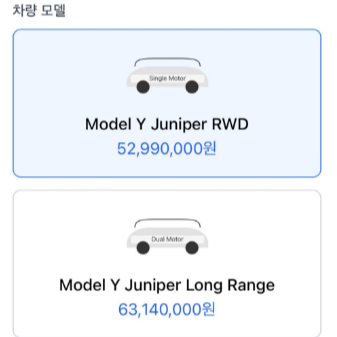 테슬라 모델 Y 주니퍼를 할부로 구매하는데 도움 되길 바랍니다. 모델, 색상, 휠, 인테리어와 할부개월 선수금 보조금 적용지역을 선택하면 바로 결과를 볼 수 있습니다. 1. 테슬라 모델 Y 주니퍼 할부먼저 테슬라 모델 Y RWD와 롱레인지 선택 후 색상을 선택합니다. 옵션에 가격이 적용되어 쉽게 클릭만 하면 됩니다.테슬라 모델 Y 주니퍼 할부 계산기 바로가기테슬라 공식 홈페이지 바로가기 2. 테슬라 모델 Y 주니퍼 할부 금액 확인테슬라 모델을 구매 계약 시 500만 원을 카드 결제해야 합니다. 모델 Y 주니퍼를 출고 초기비용은 720만 원가량 현금이 필요합니다. 참고사항위 계산 결과는 참고용이며, 실제 할부금액은 금융사의 정책에 따라 다를 수 있습니다.취등록세는 (차량가격+탁송료)/1.1*0.07-140..