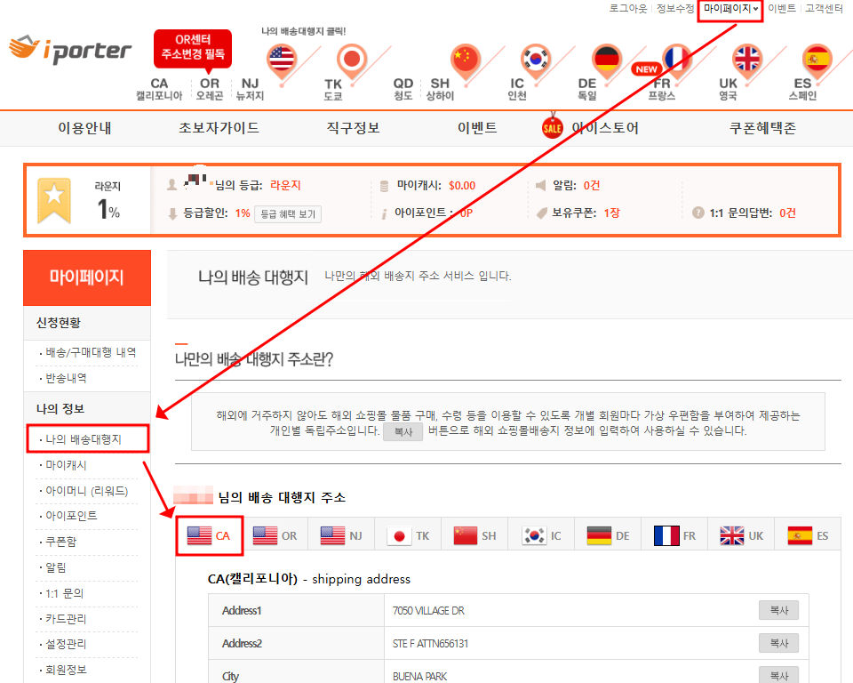 아이포터에서 마이페이지 클릭 ▶ 나의 배송대행지를 클릭하면 미국 주소를 받을 수 있습니다.
