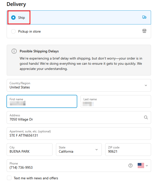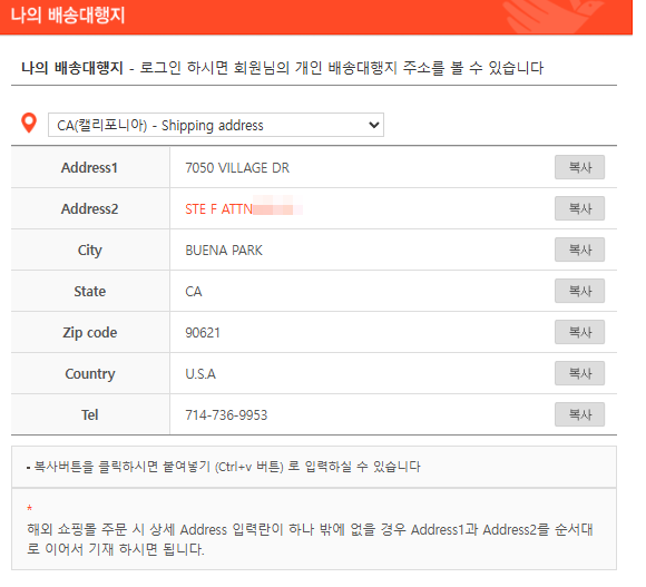 아이포터에서 받은 CA(캘리포니아)를 클릭하면 나의 배송대행지가 나타납니다. 복사 붙여 넣기로 해당 주소입력 칸에 Ctrl+V를 클릭합니다.