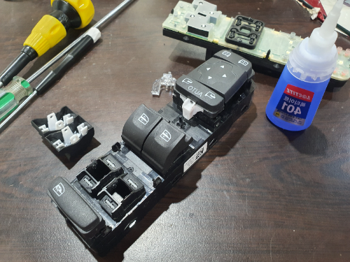부러진 힌지는 록타이트를 이용해서 붙여주고 자주 사용하지 않는 뒷좌석에 스위치를 운전석과 보조석으로 옮겨줬습니다.