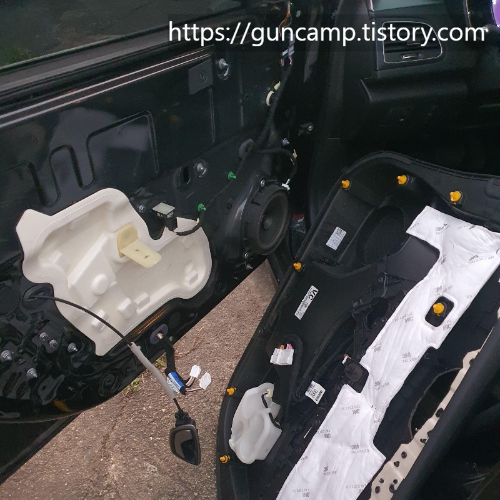 볼트를 제거하셨다면 하단을 잡고 가슴 쪽으로 잡아당겨주세요. 두둑하면서 노란색 고정 힌지가 분리되면서 뜯어집니다. 흰지 위치를 확인하시고 힘을 인가해주세요. 아래에서 위로 뜯어내시는 게 수월합니다. 분리하 되셨다면 하단의 흰색 연결잭을 분리해주시고 손잡이는 관통시켜 빼주시면 도어트림 탈거가 완료됩니다.