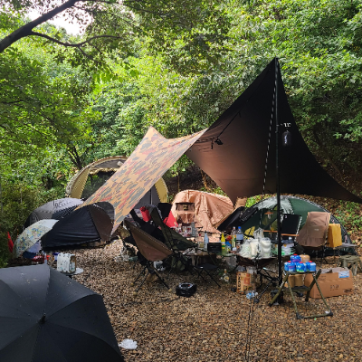 주차는 바로 앞에 하고 계단을 통해 짐을 옮겨야 합니다. 파쇄석 사이트로 1개 크기는 5m X 7m입니다. 2개 사이트 헬리녹스 터널과 어벤포레스트 헥사 타프를 설치하기에 충분한 공간입니다. 사이트 대부분 나무로 둘려 있어 프라이빗한 공간이 되어있습니다.