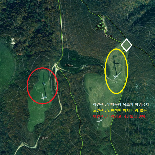 선자령 정상석을 올라가시다 보면 평지가 나타납니다. 하얀색으로 표시된 이곳은 국유지이지만 하늘목장에서 돈을 내고 임대하는 땅이기 때문에 선자령 백패킹 금지 장소라 텐트 설치를 하지면 안됩니다.