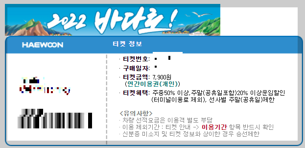 ▲바다로 티켓을 구매하시면 티켓번호가 생성됩니다. 할인받으실 때 티켓번호 입력해야 됩니다. 메모해주세요.