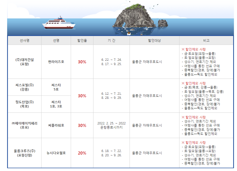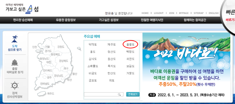 ▲2022년 바다로 티켓 울릉도, 제주도 배표 값을 50% 할인받아 싸게 가는 방법입니다. 주중 50%, 주말 20% 횟수 무제한입니다.