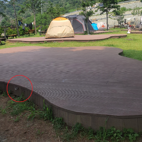 학포야영장은 그늘이 없습니다. 그나마 그늘이 있는 장소는 샤워장 앞에 데크입니다. 그늘이 있지만 전기패널에 소음이 있기 때문에 감수하셔야 합니다.