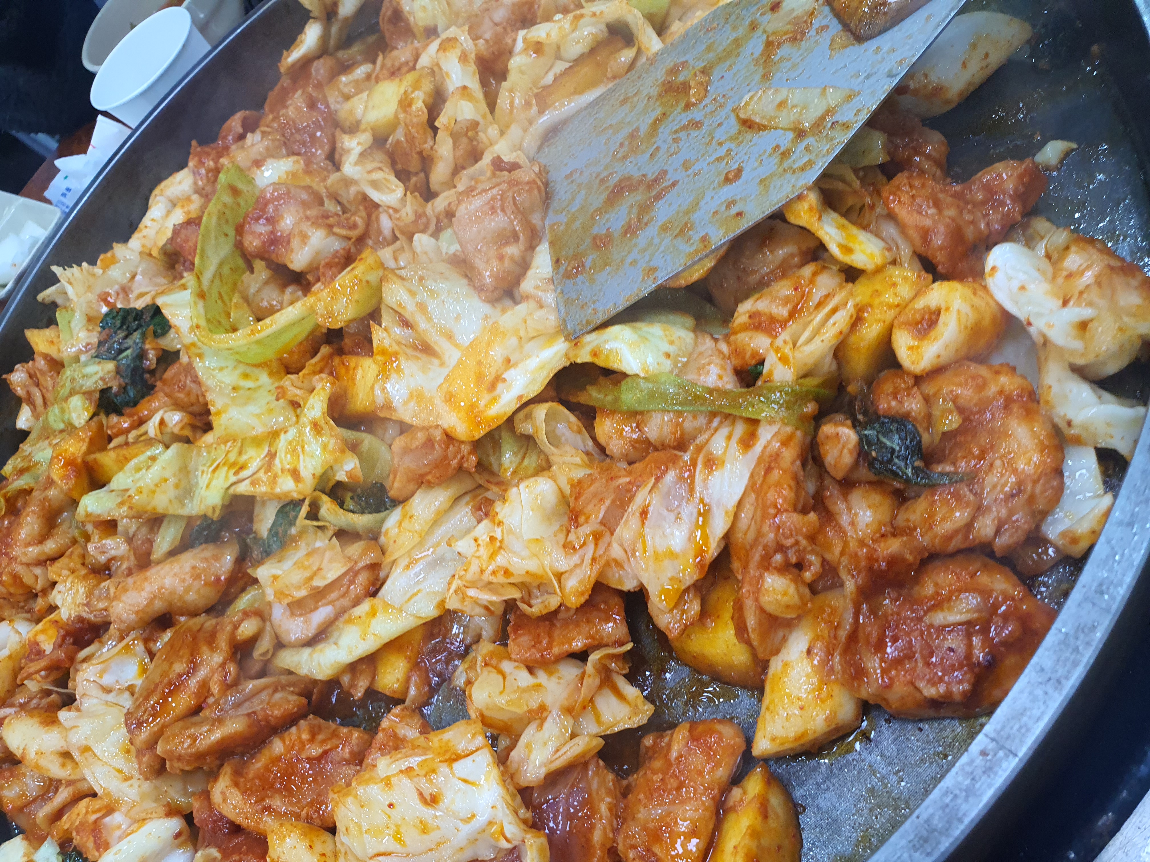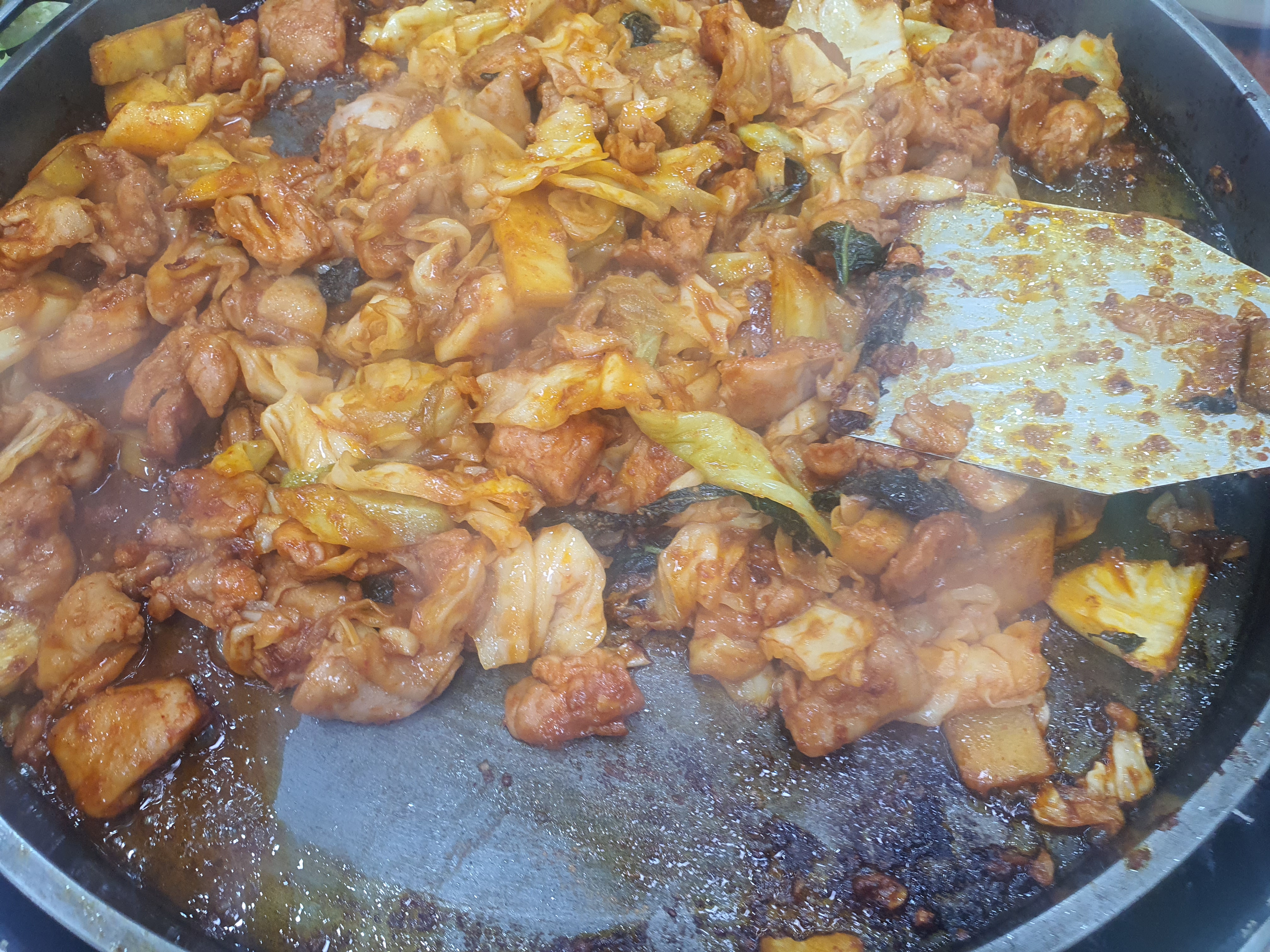 달달하면서 녹진한 양념이 철판위에서 조리가 시작됩니다. 닭갈비가 익기 전에 떡사리를 먼저 드시고 고구마가 익었다면 닭갈비는 다 익은 것입니다. 직원분들께서 신경 써주시니 익을 때까지 기다리는 게 가장 힘든 일입니다.