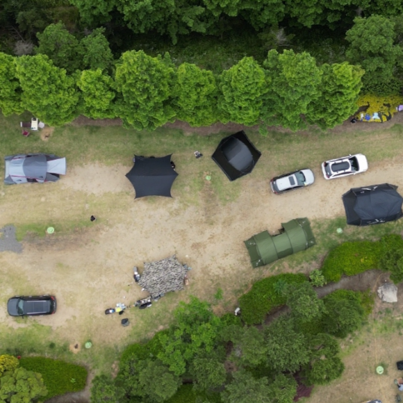 가장 안쪽 사이트로 캠핑 자리를 잡았으며 사이트가 넓기 때문에 원하는 위치에 타프와 텐트를 설치할 수 있습니다. 그늘이 없기 때문에 타프를 설치했습니다.