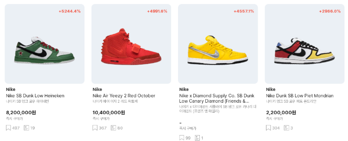 리셀 프리미엄의 끝은 신발이라고 봐도 될 정도입니다. 말도 안 되는 수익률을 보여주는 게 바로 스니커 시장입니다.
