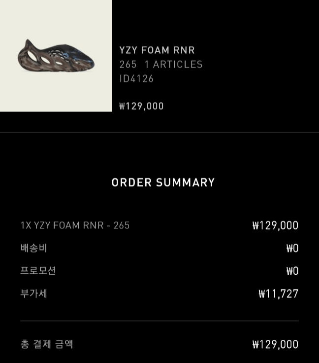 이지 폼 러너 발매는 129,000원 운 좋게 당첨되었습니다. 현재 크림 리셀가로 265 사이즈 277,000원 정도 120,000원 정도 수익이 발생했습니다.