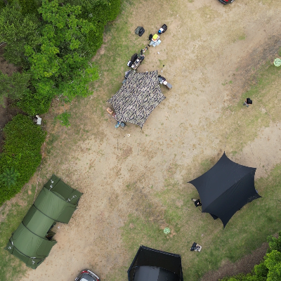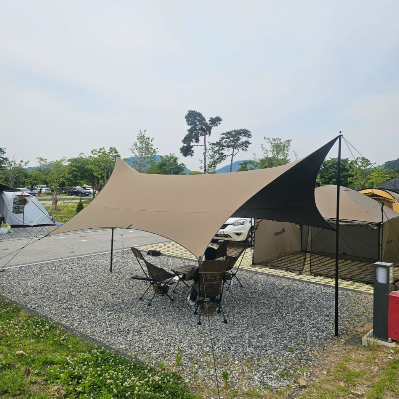 타프 원단은 견고한 방수 천으로 메인 폴대 2개와 사이드 폴대로 나뉘며 로프와 팩을 이용해 설치하고 다음과 같은 용도로 활용할 수 있습니다.