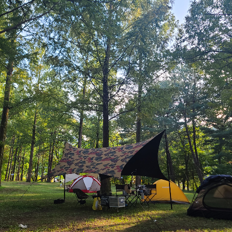 비 피하기 : 비가 오는 날 텐트 입구에 타프를 설치하여 비를 피할 수 있도록 합니다. 타프 아래에서 음식을 조리하거나 휴식을 취할 수 있고 방염 코팅이 있는 타프는 불을 피우는 행위도 가능합니다.