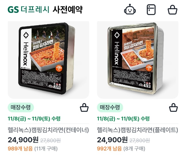 헬리녹스 라면이 GS에서 한정판으로 출시되었습니다. 플레이트와 컨테이너 결합 제품으로 2개 상품입니다. 리셀이 붙을 수 있는 제품으로 보입니다.