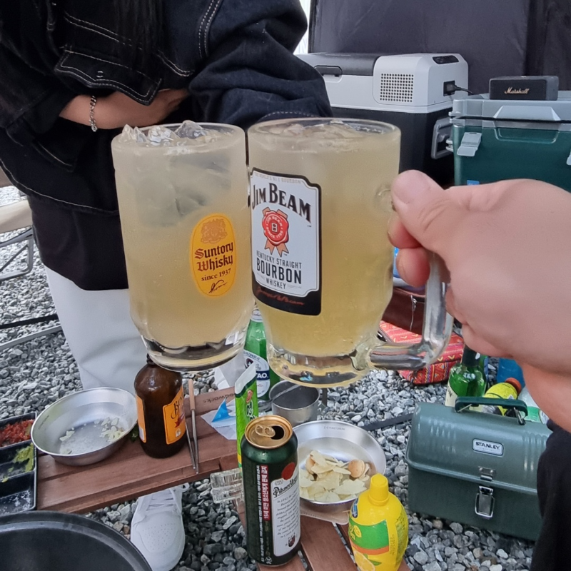 ▲캠핑의 시작을 알리는 하이 보르. 하이볼 마니아 돌비 에어컨 사장님께서 한잔식 말아 주셨다.