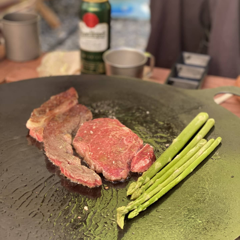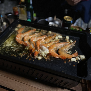 ▲본 게임 시작하기 전에 애피타이저로 등심과 새우살을 구워 본다.
