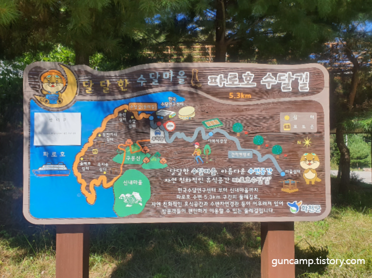 파로호 수달 길은 거리가 5.3KM입니다. 걸어서 1시간 정도 걸리고 다시 걸어서 돌아오셔도 되지만 신내마을에 가시면 보트를 운행합니다. 비용은 1인당 만원이고 파로호를 가로질러 수달연구센터로 되돌아오실 수 있습니다.
